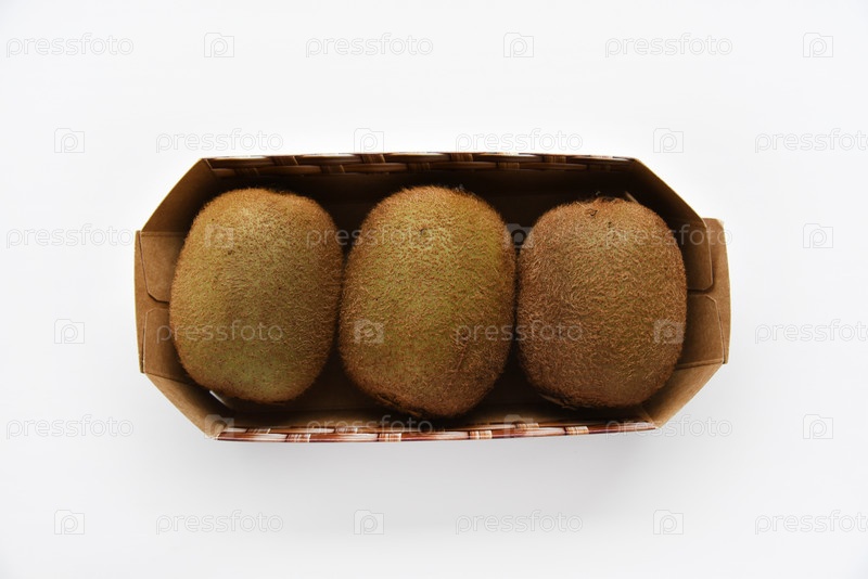 Три больших зеленых киви в бумажной упаковке на белом фоне. Киви из магазина крупным планом