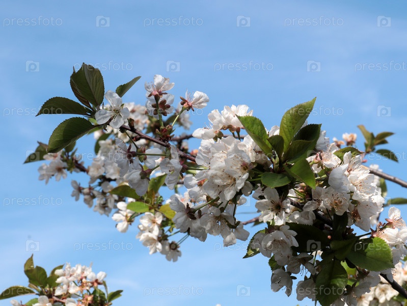 Прекрасные нежные светло-розовые цветы на ветвях яблони и облачном небе