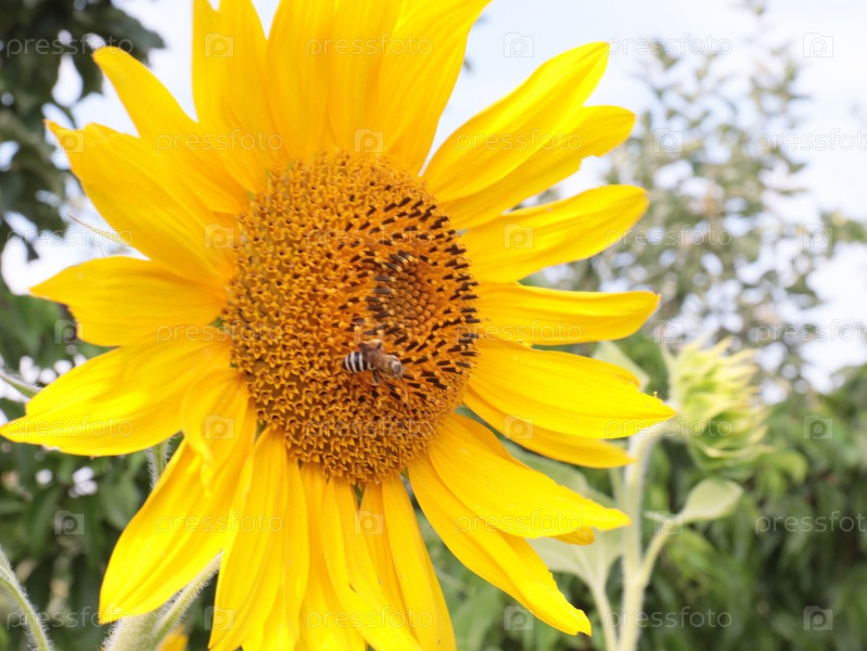Пчела опыляет красивый спелый яркий цветок подсолнуха