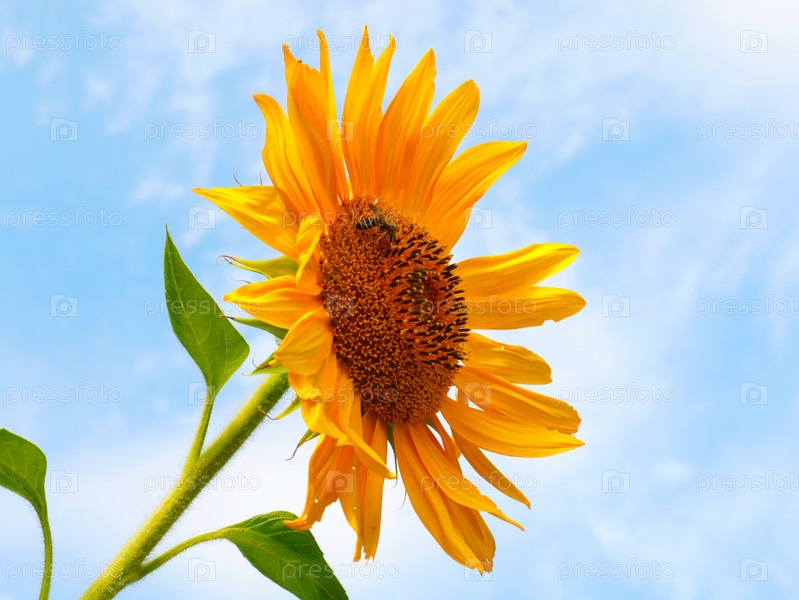 Пчела опыляет красивый спелый яркий цветок подсолнуха