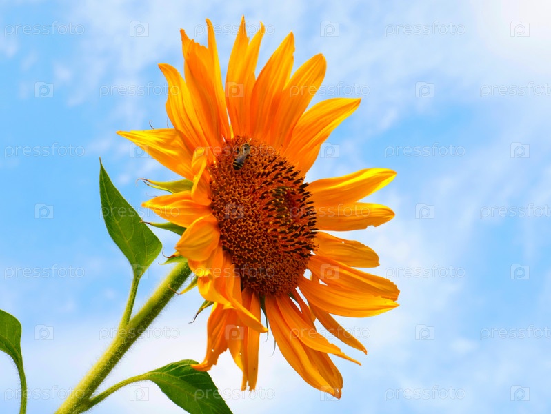 Пчела опыляет красивый спелый яркий цветок подсолнуха