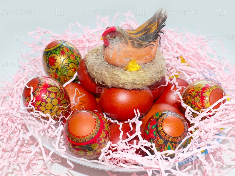 Декоративная фигурка пасхального цыпленка и куча свежих праздничных яиц