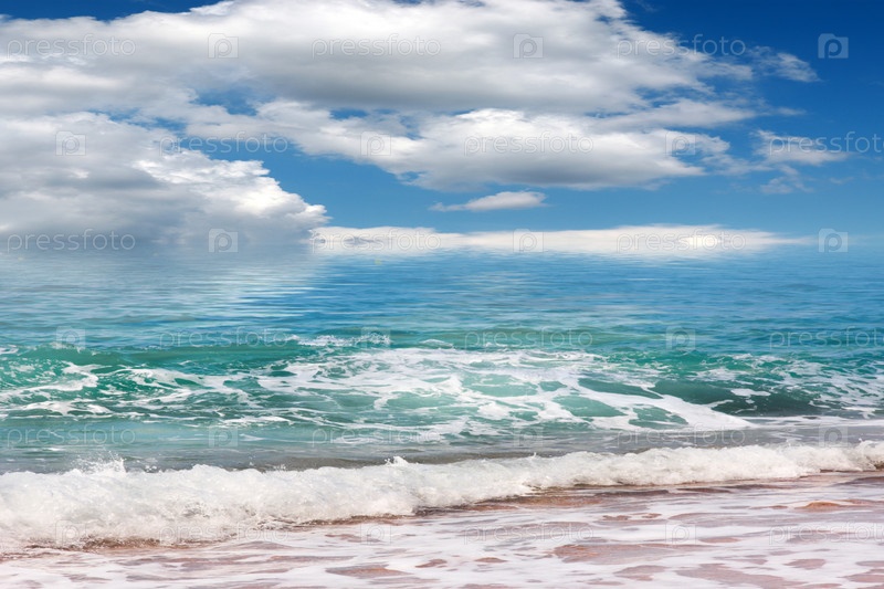 Облака в небе, ярко освещенные солнцем и спокойная гладь океана
