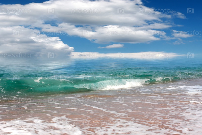 Облака в небе, ярко освещенные солнцем и спокойная гладь океана