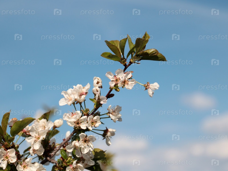 Прекрасные нежные светло-розовые цветы на ветвях яблони и облачном небе