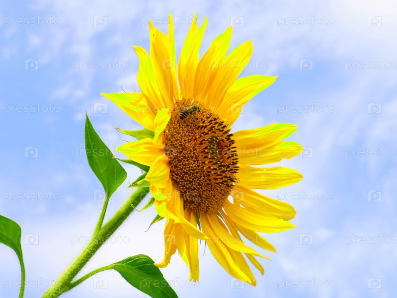 Пчела опыляет красивый спелый яркий цветок подсолнуха
