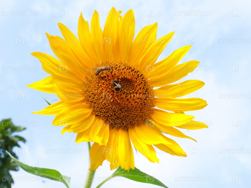 Пчела опыляет красивый спелый яркий цветок подсолнуха