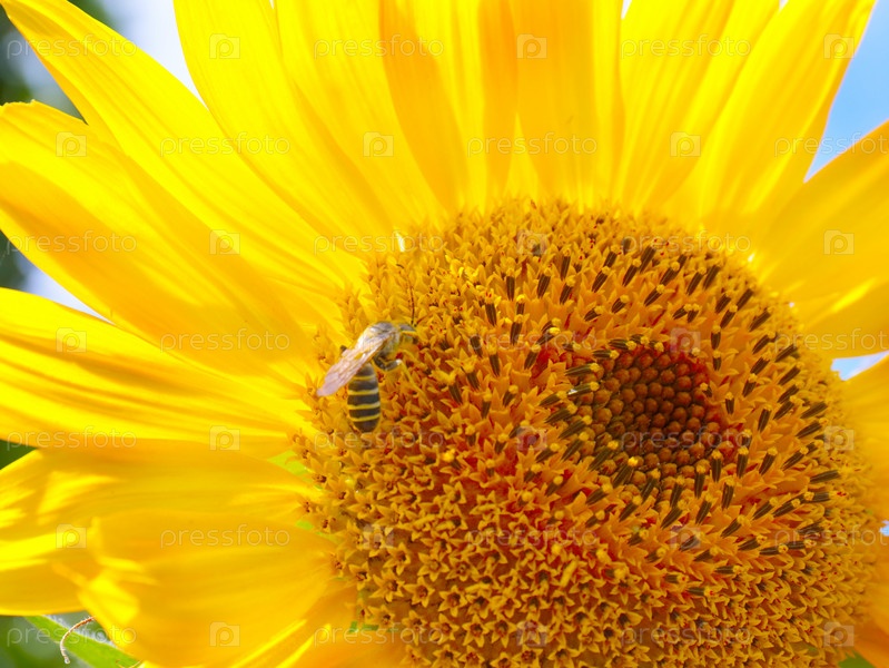 Трудолюбивая пчела собирает нектар с большого свежего подсолнуха