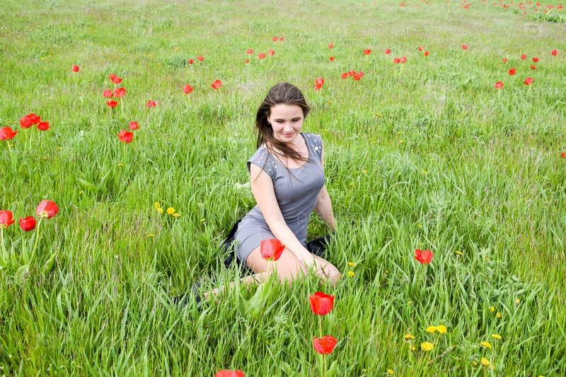 Красивая фея маленькая девочка в поле среди цветов тюльпана