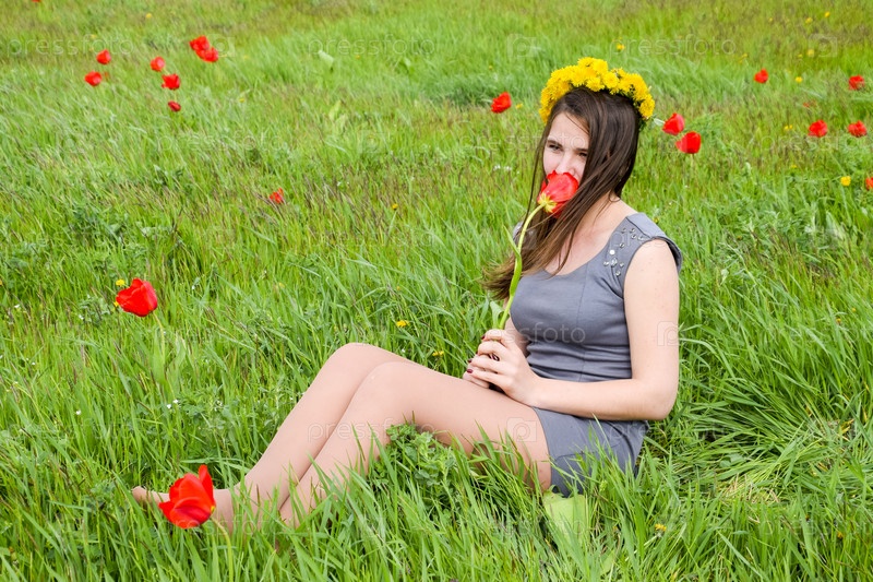 Красивая фея маленькая девочка в поле среди цветов тюльпана