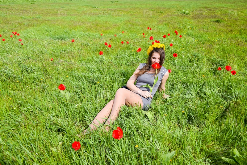Красивая фея маленькая девочка в поле среди цветов тюльпана