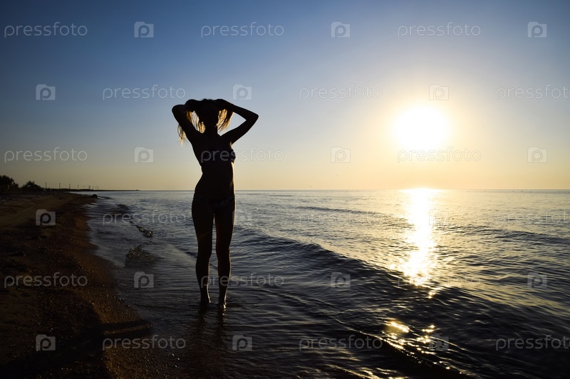 Силуэт девушки на фоне заката у моря