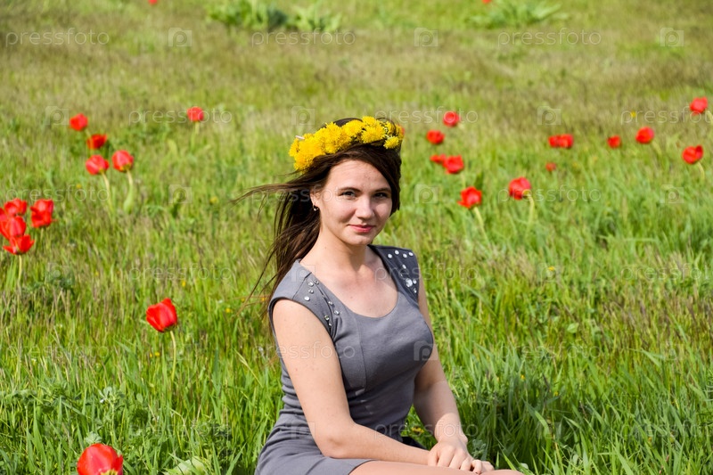 Красивая фея маленькая девочка в поле среди цветов тюльпана