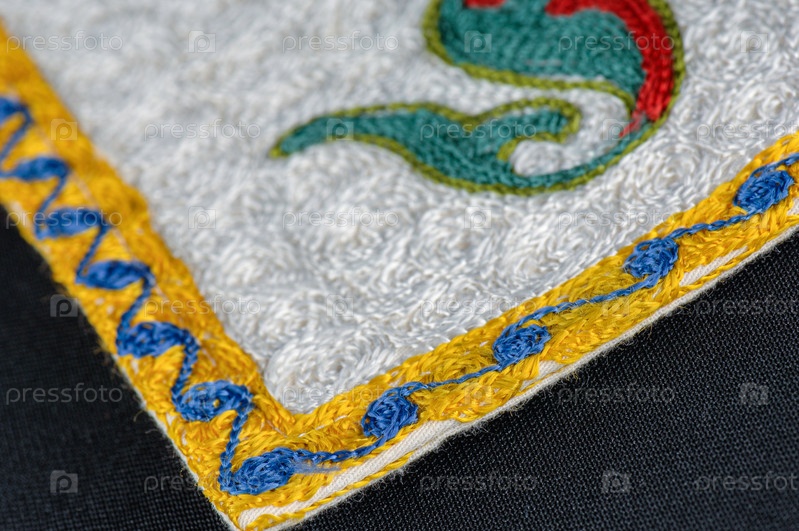 Крупный план национальных орнаментов и узоров Средней Азии на куске ткани