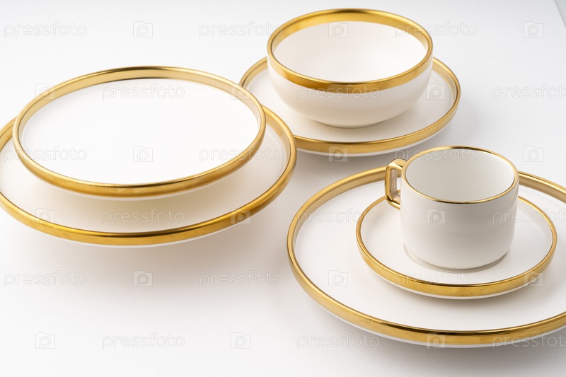 Набор белых и коричневых керамических тарелок и чашек на белом фоне