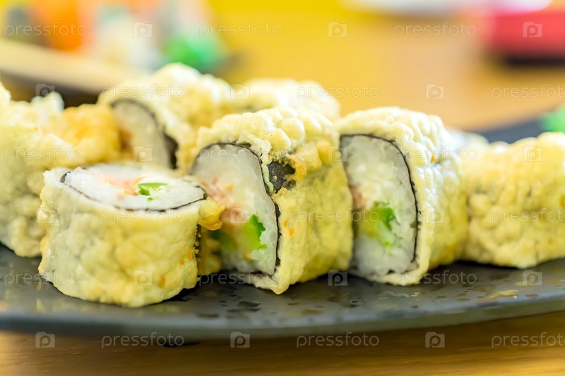 Жареный суши-ролл с лососем, угрем, телячьей икрой и сыром. Японская еда