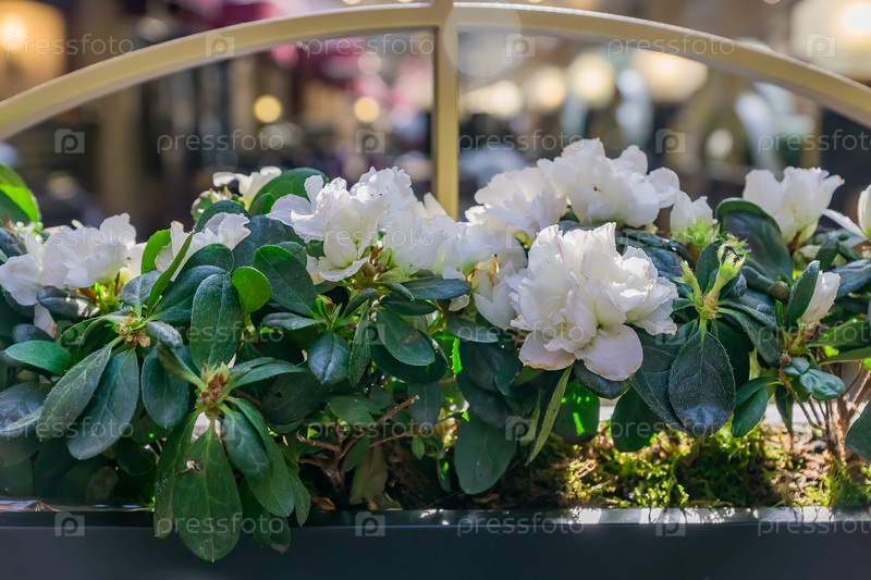 Цветущие белые рододендроны в цветочном горшке. Домашнее садоводство. Дизайн интерьера