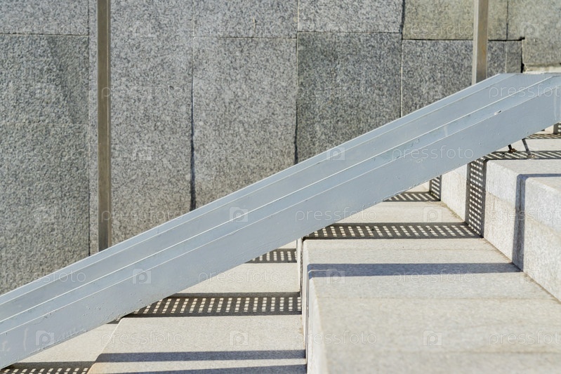 Плиточные лестницы и пандус со стальными перилами для инвалидных колясок, тележек и колясок с гранитной стеной и жесткими тенями от солнца. Абстрактный фон города