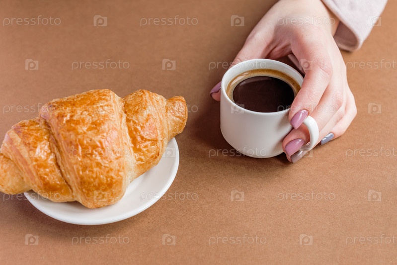 Женская рука с маникюром держит чашку кофе и ест круассан. Завтрак во французском стиле