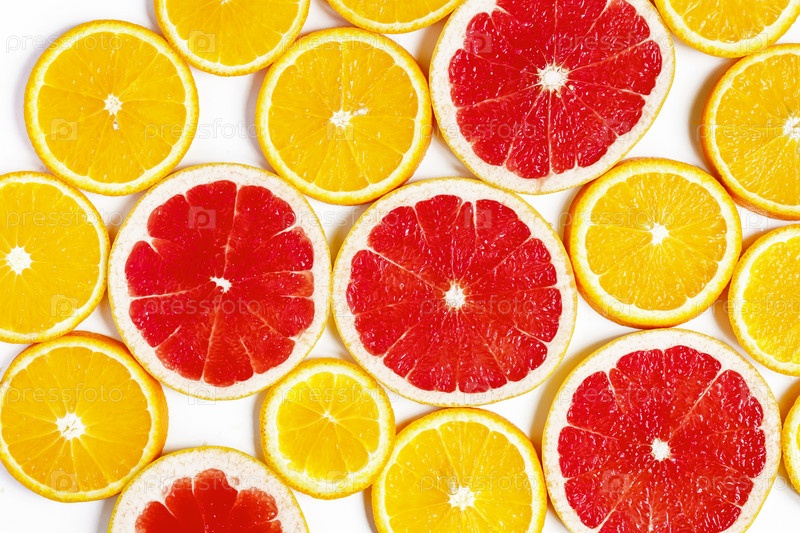 Ломтик цитрусовых, апельсины и грейпфруты на белом фоне. Фруктовый фон