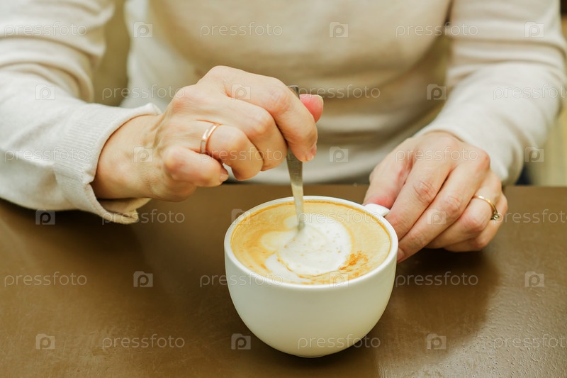 Женская рука перемешивает чашку кофе. Утренний свежеприготовленный капучино