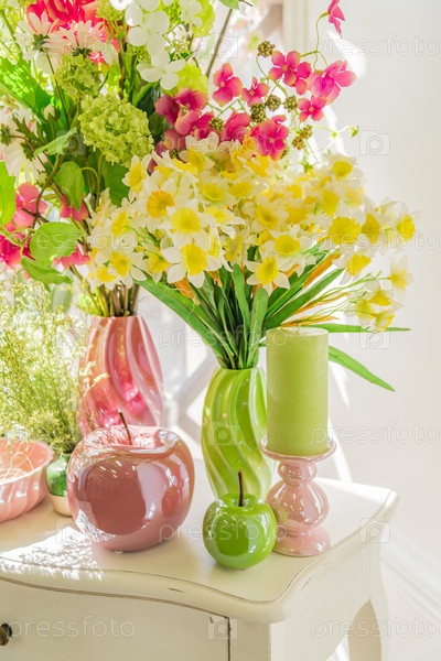 Красивые цветы в зеленых и розовых вазах, свечи и стеклянные яблоки на белом деревянном комоде. Весеннее украшение интерьера