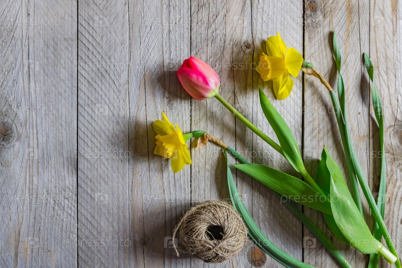 Вид сверху на букет весенних цветов. Желтые нарциссы и розовый тюльпан на деревянном фоне. Скопируйте пространство