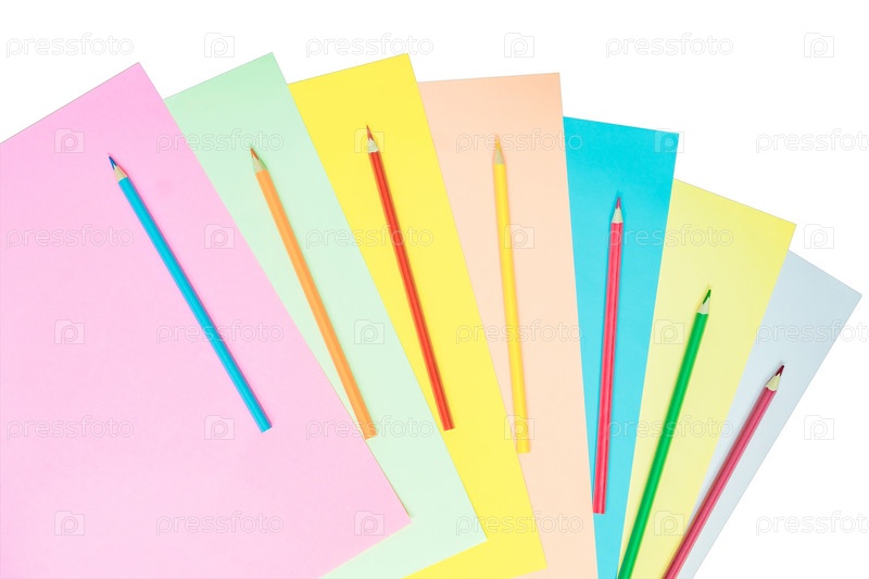 Креативная квартира лежала со школьными принадлежностями. разноцветные карандаши и пастельная цветная бумага на белом фоне