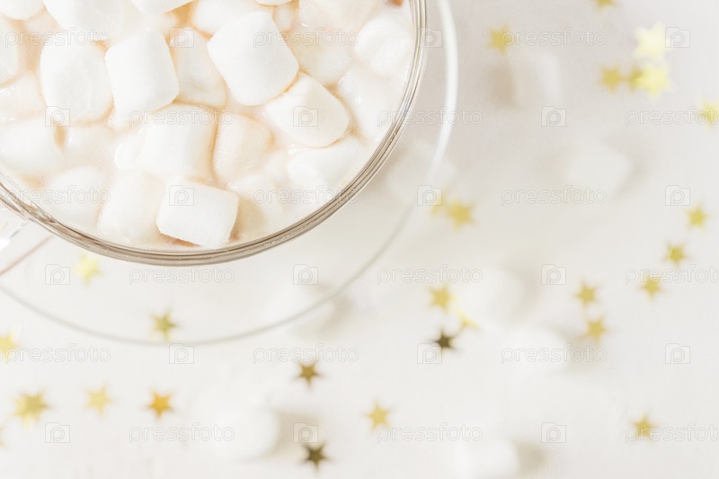 Вид сверху на чашку горячего вкусного какао-напитка с зефиром на фоне золотых звезд