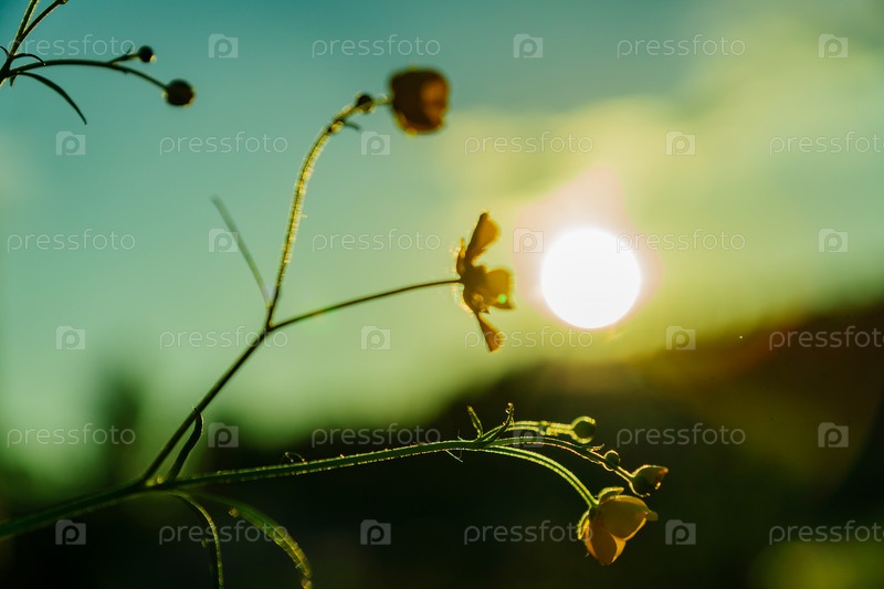 Красивые желтые полевые цветы цветки лютика в свете заката. Фон природы
