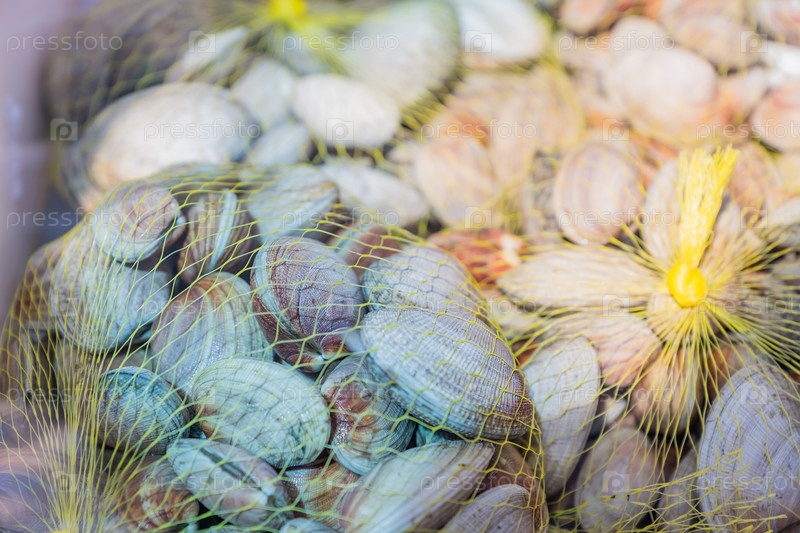 Фон свежие моллюски. Сложены свежие сырые моллюски на витрине