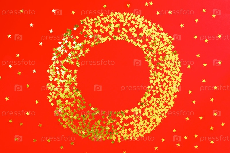 Красный фон с блестками и золотыми звездами конфетти по кругу. Праздничный праздник яркий фон