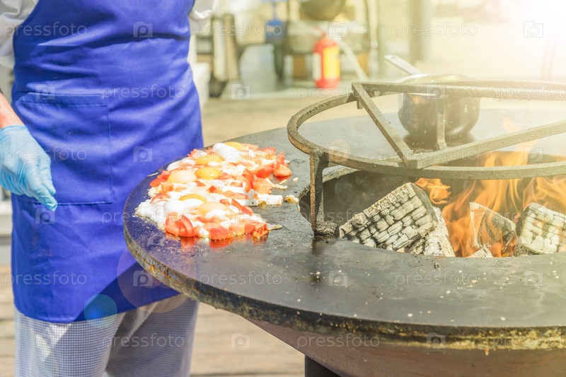 Шеф-повар готовит яичницу с помидорами на фестивале. Уличная еда, приготовленная на гриле