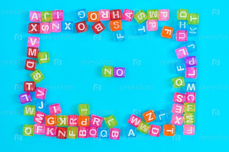 НЕТ надписи из разноцветных кубических бусин с буквами. Праздничная концепция синего фона с копировальным пространством