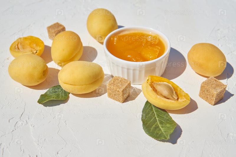 Домашнее органическое абрикосовое варенье и спелые абрикосы и коричневый сахар на белом фоне