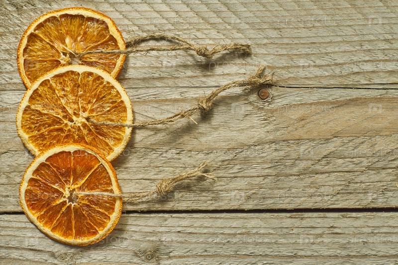 Рождественский декор. сушеные апельсиновые дольки для украшения новогодней елки на деревянном фоне