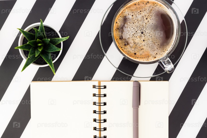 Стильное минималистичное рабочее пространство с блокнотом, ручкой, чашкой кофе и сочными на полосатом черно-белом фоне. Плоский вид сверху