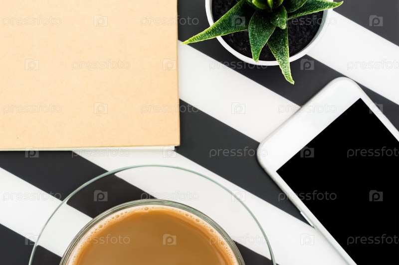 Стильное минималистичное рабочее пространство с блокнотом, ручкой, чашкой кофе, смартфоном и сочными на полосатом черно-белом фоне. Плоский вид сверху