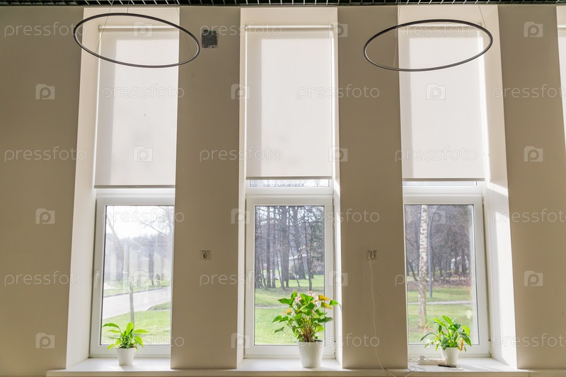 Внутренний вид на окна с цветами в горшках на подоконнике