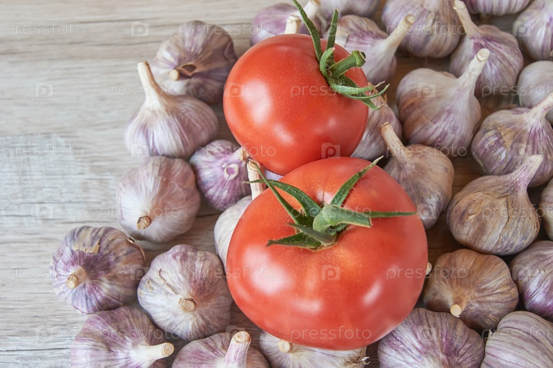 Свежий урожай чеснока и помидоров на деревянном столе. Концепция органических продуктов питания