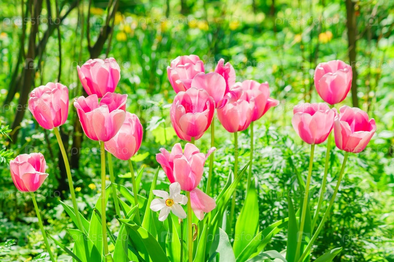 Крупный план цветущего поля розовых тюльпанов, цветочный фон