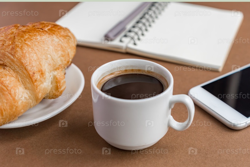 Перерыв на кофе с круассаном и эспрессом. Фрилансер на работе