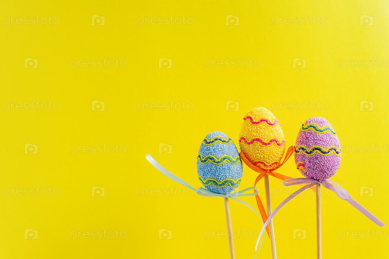 Пасхальные фиолетовые, желтые и синие украшенные яйца стоят на деревянных палочках на желтом фоне. Минимальная пасхальная концепция. Счастливой Пасхи открытка с копией пространства для текста