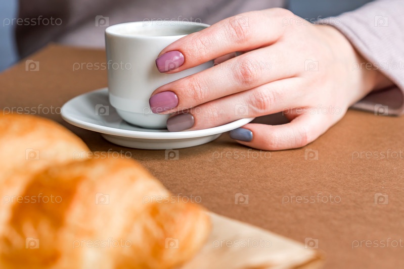 Женские руки с маникюром держат чашку кофе и едят круассан. Завтрак во французском стиле