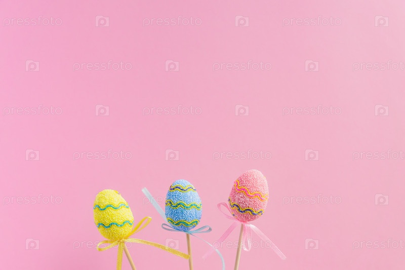 Пасхальные фиолетовые, желтые и синие украшенные яйца стоят на деревянных палочках на розовом фоне. Минимальная пасхальная концепция. Счастливой Пасхи открытка с копией пространства для текста