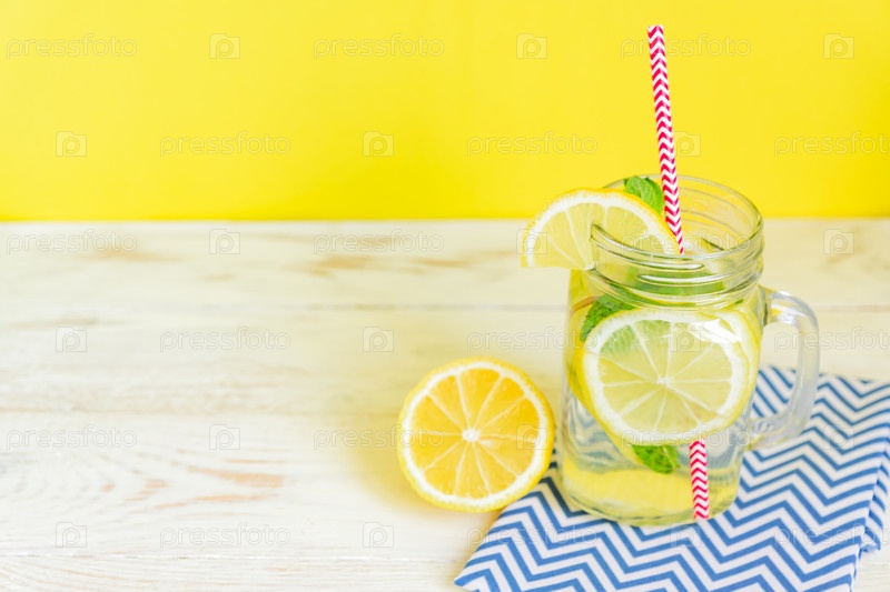 Стакан каменщика домашнего лимонада с лимонами, мятой и красной бумажной соломой на деревянном деревенском фоне. Летний освежающий напиток