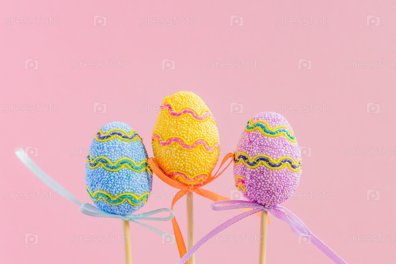 Пасхальные фиолетовые, желтые и синие украшенные яйца стоят на деревянных палочках на розовом фоне. Минимальная пасхальная концепция. Счастливой Пасхи открытка с копией пространства для текста