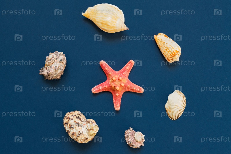Вид сверху на морские раковины и морские звезды на темно-синем фоне. концепция летнего отдыха и отпуска