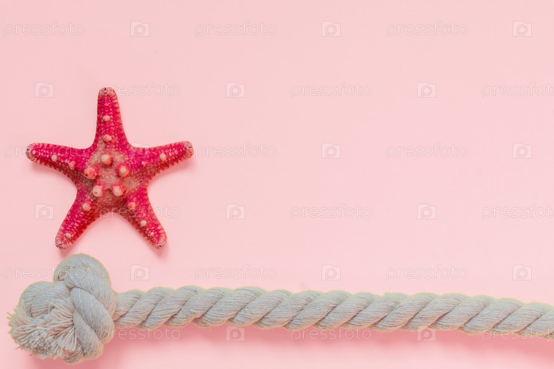 Красная морская звезда и веревочный узел на ярко-розовом фоне с копировальным пространством. концепция летнего отдыха и отпуска