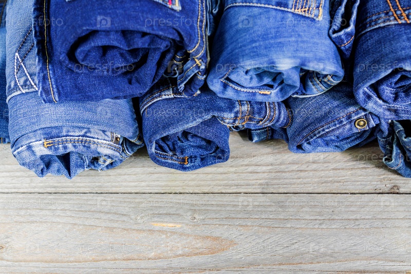 Вид сверху на рулон синих джинсовых джинсов, сложенных в стопку на деревянной полке. Концепция красоты и модной одежды